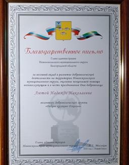 05 декабря 2025 года в День волонтера ЛЮТАЯ Надежда Николаевна также награждена Благодарственным письмом Главы Новооскольского муниципального округа. Награду вручили заместитель главы администрации Новооскольского муниципального округа Лавренова Татьяна Николаева и депутат Белгородской областной Думы Ананичев Михаил Афанасьевич.